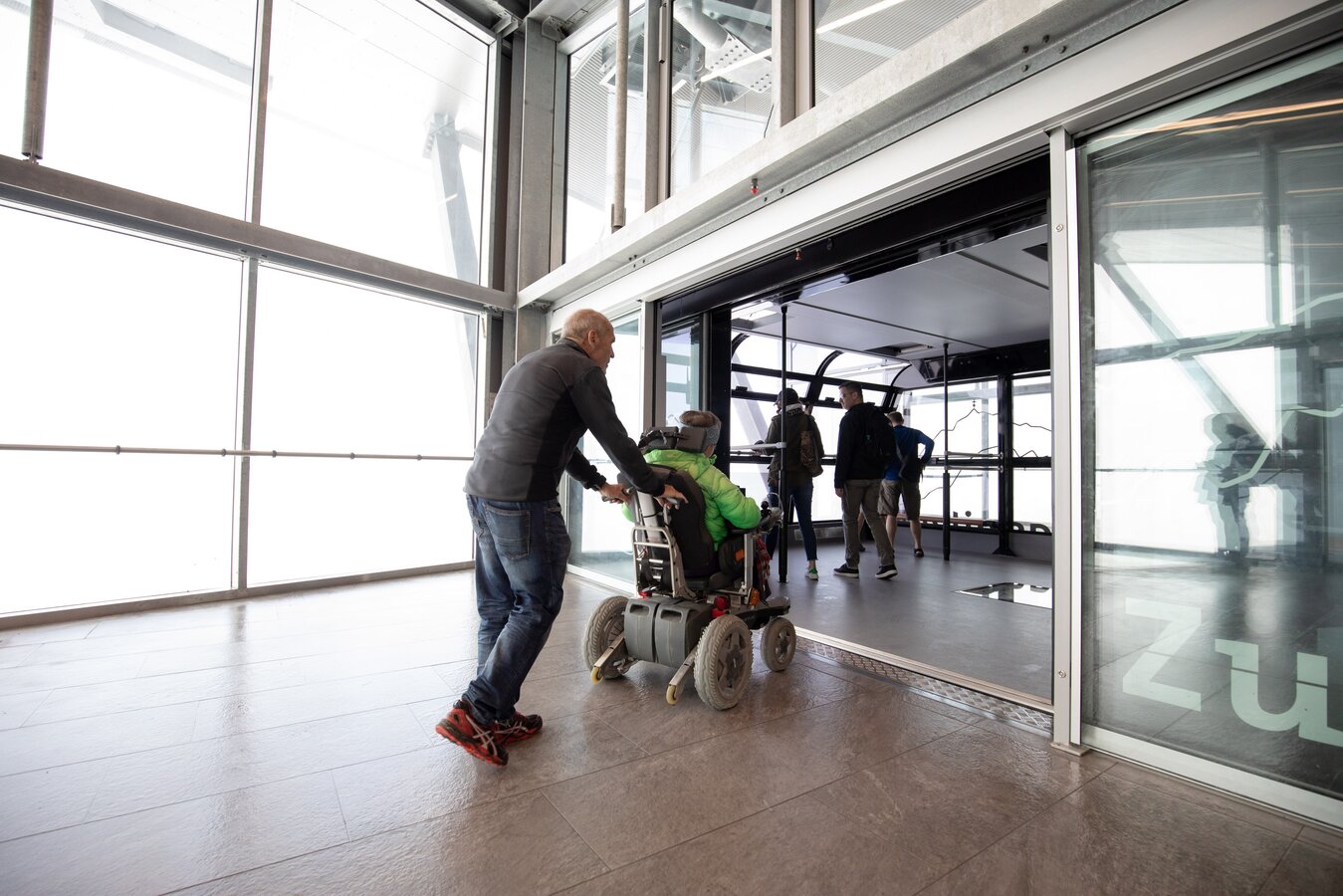 - Talstation Seilbahn Zugspitze: Der Zu- und Abgang zu den Seilbahnkabinen befindet sich auf einer gut zugänglichen Ebene – das Ein- und Aussteigen ist so ganz unkompliziert möglich.