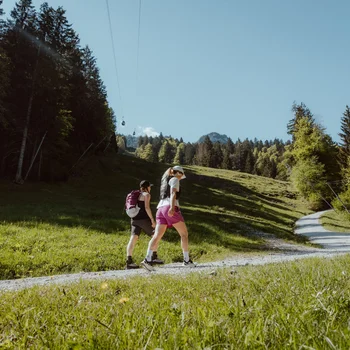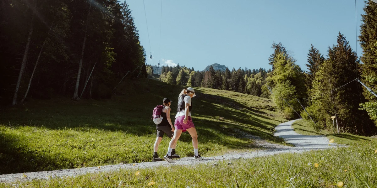 To the left of the Kandahar-Express, you first walk along the Olympia-Abfahrt – a parallel valley run in winter – through a small forest and finally cross the “5b” variant of the legendary ski run.