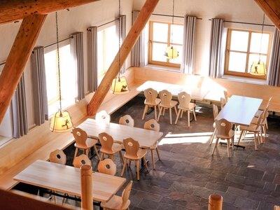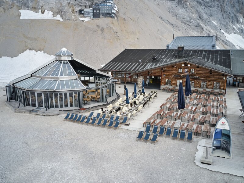 A cosy ambience and breathtaking views: The self-service restaurant by the Zugspitze glacier offers varied daily dishes from Bavarian cuisine. International specialities and vegetarian delicacies round off the menu.